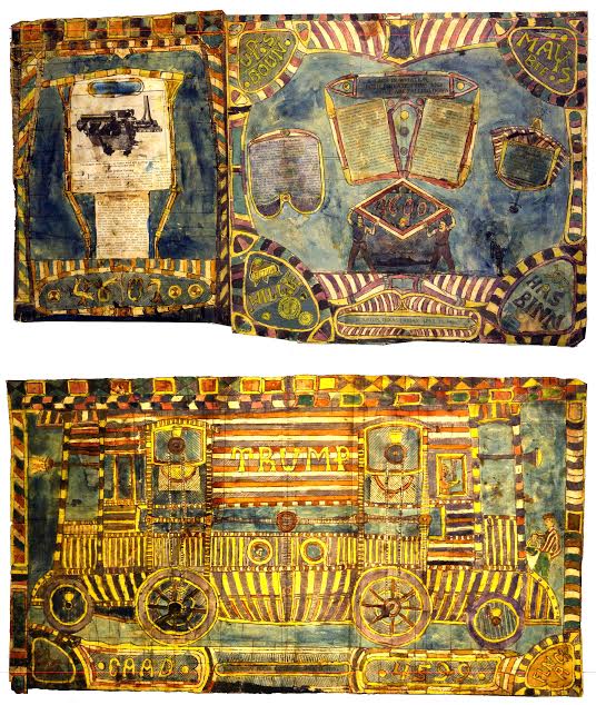Multiple machines labeled TRUMP. Machines built by German immigrants who were very secretive and disappeared in America around 1860, never to be found again, we are told.